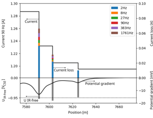 Situation. The surveyed pipeline partially traverses an airport perimeter and a nearby suburban neighborhood. FIG. 11 shows the current running in the pipeline at an exemplary frequency of 90 Hz as the black line. Additionally, the current loss is plotted at each defect as a colored bar stacked behind each other for the different frequencies applied. The resulting ground potential gradients (black line) and the calculated EIR-free (gray bars) are also displayed, indicating the relative size of the coating defect and the classification of defects according to the protection criteria of DIN EN ISO 15589-1 respectively. The black dotted line indicates an EIR-free of –0.95 V, with more negative values meeting the criteria for an effective CP protection.