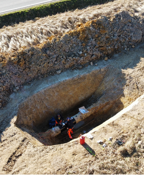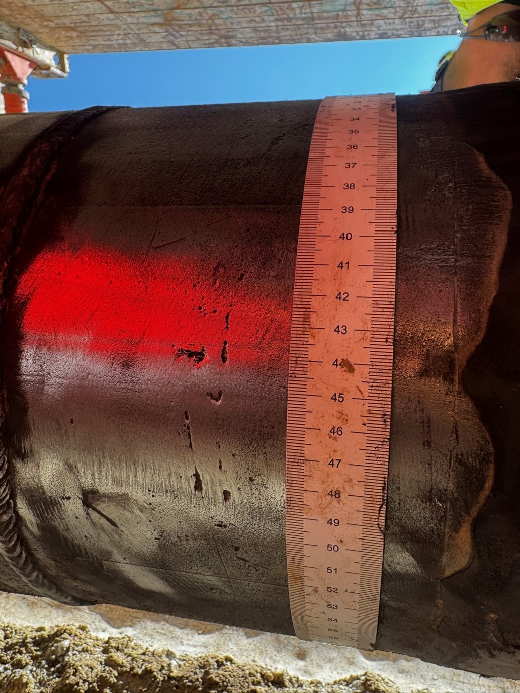 Verification. The excavation of the defect, which was in the populated area as seen in FIG. 12, confirmed its exact position and existence as predicted by CMI. After excavation, active corrosion was identified, confirmed by corrosion byproducts and a slightly acidic pH at the steel surface. Additionally, the exposed and cleaned steel surface exhibited pronounced, localized metal loss consistent with the ILI data, as demonstrated in FIG. 13. These observations confirmed that the CP system was locally ineffective, as concluded from the CMI assessment.