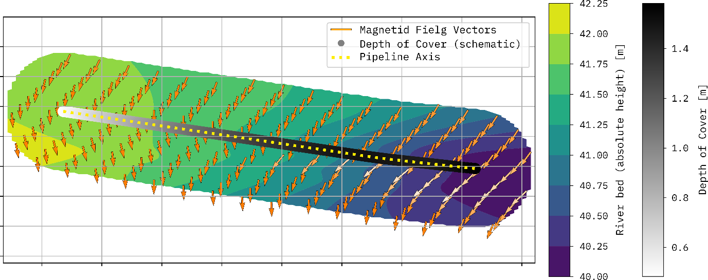 Next to the current on the pipeline, the measurement data allows the identification of the current flow direction and the distance of the buried pipeline from the inspection system above ground at any given moment. Combined with additional information from light detection and ranging (LiDAR), sonar or radar, and the system’s orientation, it makes CMI one of the most accurate method for absolute 3D pipeline positioning—even for complex structures and unpiggable pipelines.