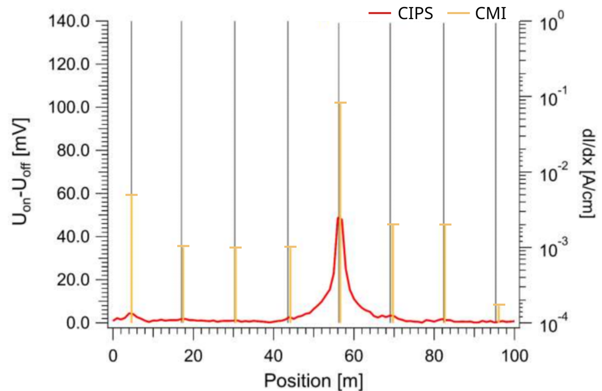 - CMI provides more reliable insights for information-based decision-making, as detection sensitivity is much higher for smaller defects at the same inspection conditions. Independent of the bedding, all coating defects of a size of 1 cm2 were located correctly with CMI, while CIPS was able to identify 20%.