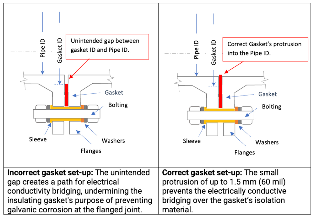 The issue arises when the pipe schedule and gasket ID are not specified in the gasket purchase order. In such cases, the gasket may be delivered with default dimensions, per spiral wound gasket (SWG) standards. SWG ID dimensions are inherently larger than standard pipe IDs, as they are not required to match the pipe bore, resulting in a gap of several millimeters between the pipe and gasket in some cases. This gap increases with thicker pipeline walls, leaving a larger portion of the flange face surfaces exposed. The exposed area creates a risk for electrically conductive bridging between these surfaces. This risk of galvanic corrosion may be further exacerbated by sludge, deposits and liquid accumulation in the gap, particularly at the bottom (6 o’clock position) of the pipeline.