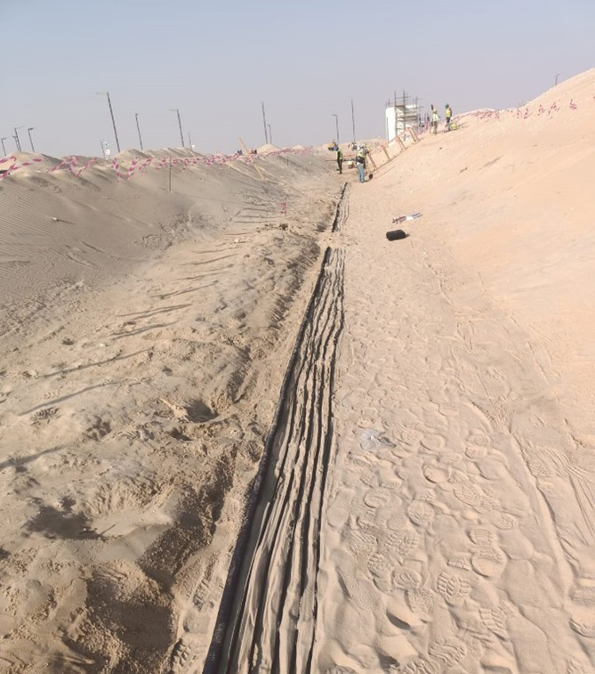 This section outlines the proposed CP system by linear MMO anodes for new 8-in. and 6-in. underground header and branch underground piping’s network. The total length of the gas grid distribution piping network is 4,900 meters (m). The pipes will be protected by a permanent ICCP system for 25 yrs, according to CP specifications, by using new CP systems of 25V/15A rating. The MMO linear anodes consist of a long MMO/titanium (Ti) wire welded to multiple spots with copper cable packaged in fabric jacket and fulfilled with calcinated coke. The wire will be installed parallel to the pipelines in the same trenches by maintaining a minimum distance of 0.5 m–0.8 m (FIGS. 4 and 5).