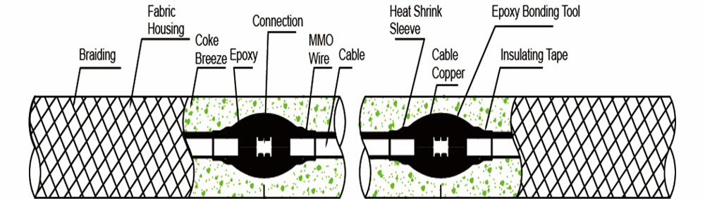 The MMO anode wire is connected to the header cable at the factory via a high-pressure crimp connector to ensure a low-resistance connection. That connection is then sealed in a splice kit with epoxy resin to prevent water intrusion.9 The header cable to anode feeder cable connections are performed onsite as per manufacturer specifications and standard procedures.