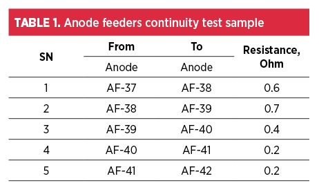 The CP system must be examined to confirm the proper installation of all components. It is crucial to verify the connections and continuity of the positive anode cables. Resistance measurement between various anode feeders and between different main positive cables is required to ensure electrical continuity. The resistance reading should be less than 1 ohm. Sample results of the continuity test are detailed in TABLES 1 and 2.