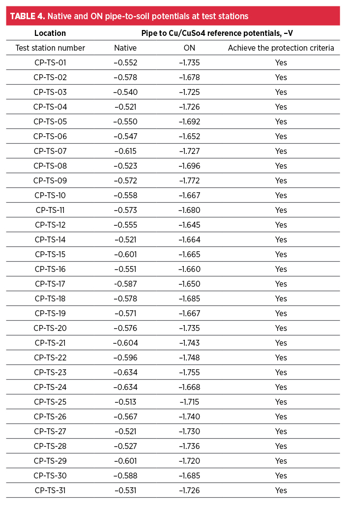 The CP commissioning activities were completed. During the commissioning, temporary sacrificial anodes were disconnected and the piping given 96 hrs to depolarize before the native potentials were measured. These lay in the range of –410 mV to –635 mV copper/copper sulfate (CSE) with an average of –550 mV. The permanent CP was commissioned and energized and the piping allowed to polarize for 48 hrs at 4.5 V/2.2 Amp setting. ON pipe to soil potentials were measured at all test stations and the instant-off pipe to soil potentials were then measured at DC coupon test stations. Both ON and instant-off potentials met the required CP criteria as specified in company specifications. The records of native, ON and the instant-off pipe to soil potentials are shown in TABLES 3 and 4.