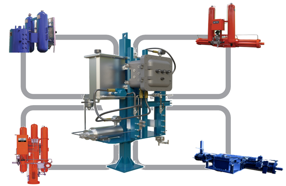 The accumulators are generously sized to allow multiple valve strokes, so the small, low-power motor has a long time to reinject the gas. The motor can be solar powered, which works well for remote sites where power is limited. The system can also include a hand-powered hydraulic pump for emergency or pressureless pipeline operation.