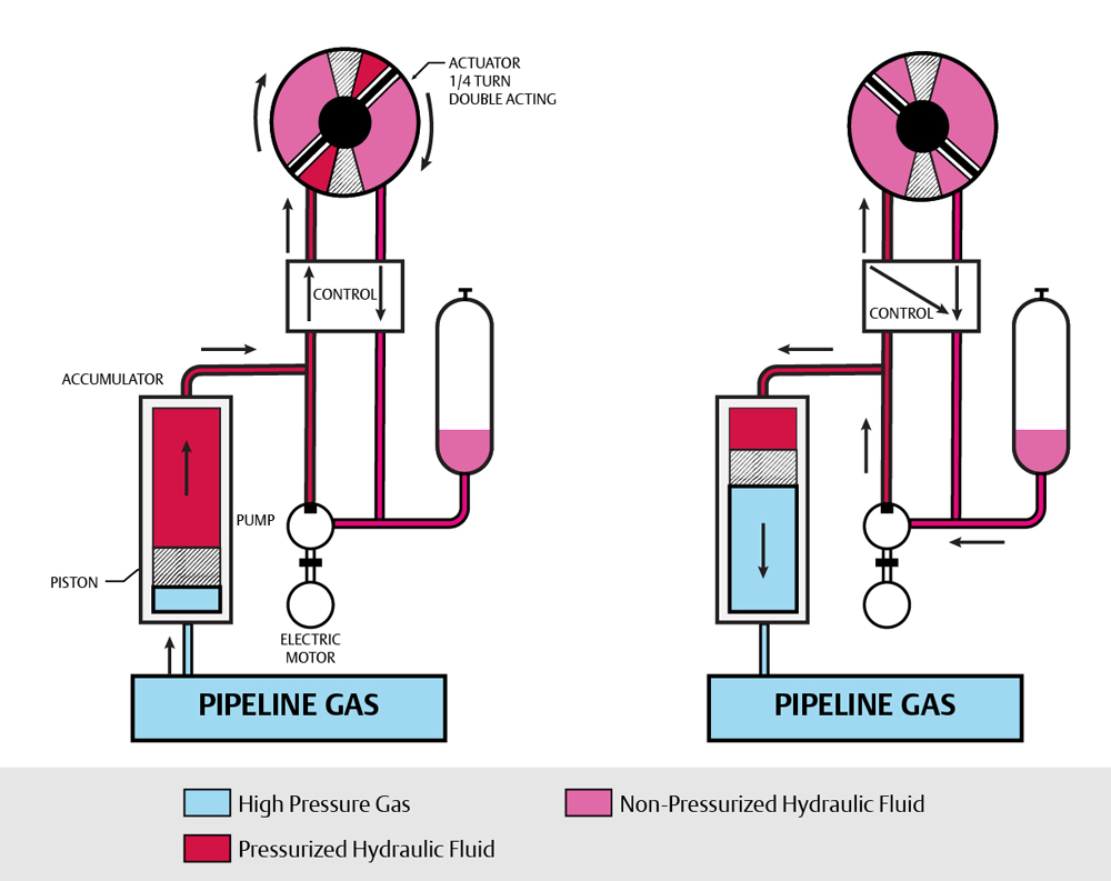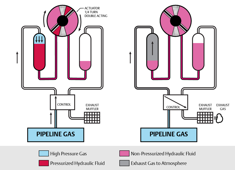 Zero emissions gas-over-oil actuation. A zero-emissions alternative for gas-over-oil applications has been introduced: like gas-over-oil technology, it is well-suited for large valve, high-torque and/or high-speed applications. The author’s company’s emissions-controlled actuation technology (ECAT)ᵃ uses many of the same components but adds a small, low power re-injection motor (FIG. 3). High-pressure gas is used to drive the valve as before; however, after the stroke the small motor slowly drives the gas back into the pipeline, resulting in zero emissions. High-pressure gas can be routed to the other side of the actuator to reverse the valve stroke.