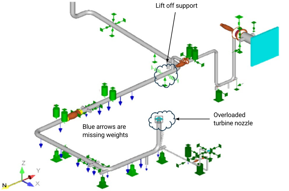 A solar power plant project was designed and installed in the field. Before the piping was connected to the turbine nozzle, the springs were released, and the piping dropped 150 millimeters (mm) instead of the anticipated 2 mm (FIG. 4). Upon further and more careful analysis, it was determined that the dead loads had been grossly underestimated by more than 40%.