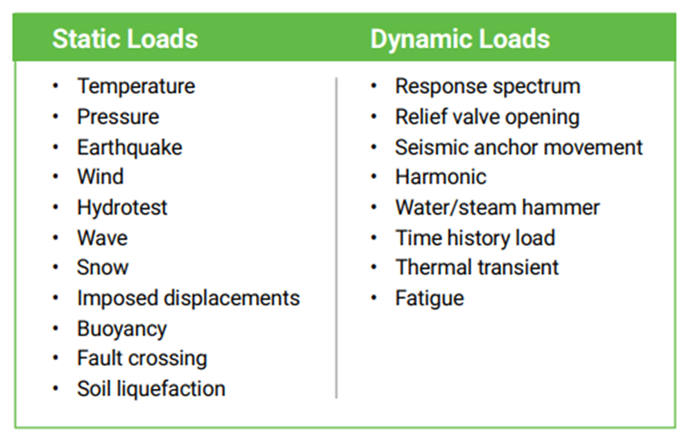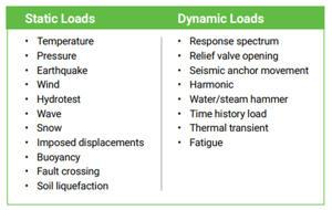 Before delving too deeply into the topic, it is worth clarifying that there are generally two steps to piping system engineering: design and analysis. The first step, design, creates the overall piping network. In this phase, the pipe sizes are calculated based on pressure drop and flow requirements. Meanwhile, material selection and pipe pressure classes are chosen based on process media, pressure, temperature, process conditions and other factors. Typically, in this phase, a full-scale 3D computer-aided design (CAD) model is generated that includes all the details required for construction. Once this piping network has been designed, it must then be thoroughly analyzed to ensure it can handle the various loads placed upon it over its lifecycle. These stress loads are much more extensive and varied than one might initially imagine, and they can include both static and dynamic loads (FIG. 1).