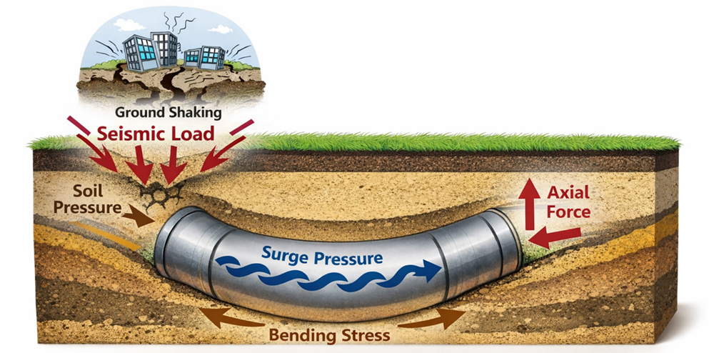 FIG. 1. Conceptual schematic illustrating the combined action of surge-induced internal pressure, seismic excitation and soil-pipeline interaction on a buried pipeline bend in soft or liquifiable soil. The figure highlights the concentration of stresses and deformation demand at bends under multi-hazard conditions, emphasizing the need for special design and analysis beyond single-hazard assumptions.