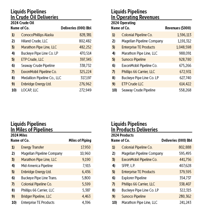 By miles of liquids pipelines, Energy Transfer operates the largest system, followed by Magellan Pipeline Company and Marathon Pipe Line. Mid-America Pipeline, Enbridge Energy and Buckeye Pipe Line Transmission also rank among the Top 10.