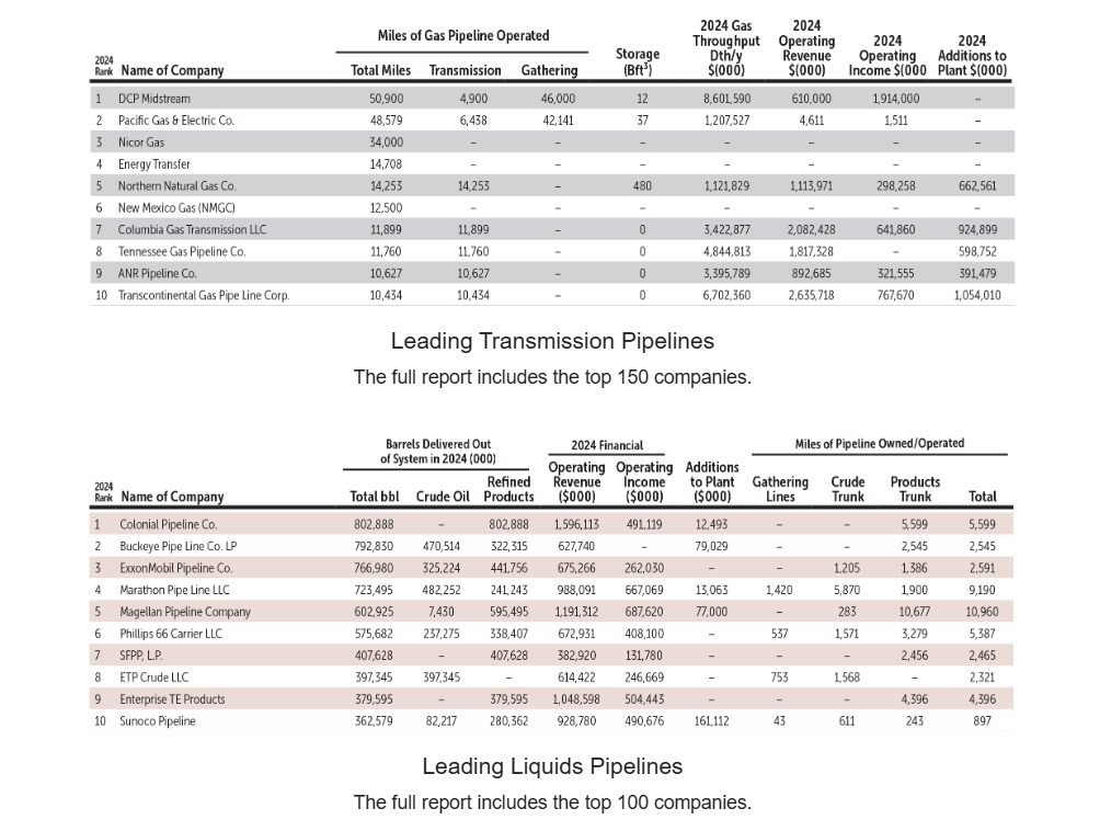 Each year, P&GJ’s 500 Report provides the industry’s most comprehensive listing of U.S. energy pipeline systems, ranking gas distribution, gas transmission and liquids pipeline companies. Gas distribution companies are ranked by number of customers. Gas transmission companies are ranked by miles of pipe operated, while liquids pipeline companies are listed by total crude oil and products delivered.