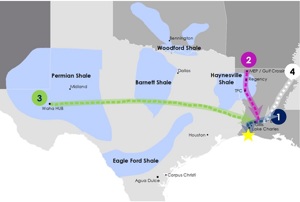 The pipeline network also includes the proposed Haynesville Global Access Pipeline (HGAP) and the Driftwood Pipeline. HGAP would be a 200-mile, 42-inch pipeline with capacity to transport 2 Bcf/d to the same interstate pipelines near Gillis. The 96-mile, 48-inch Driftwood Pipeline would provide 4 Bcf/d transport from Gillis to the Driftwood LNG facility.