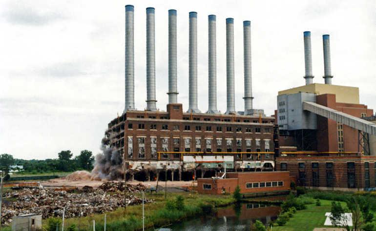 DETROIT — A Detroit power plant that was more than 100 years old was demolished Friday to accommodate a Jeep factory.