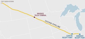 The Cochin Pipeline currently transports light condensate from receiving points at Kankakee County, Illinois; Clinton, Iowa; and Maxbass, North Dakota to Fort Saskatchewan, Alberta, Canada.