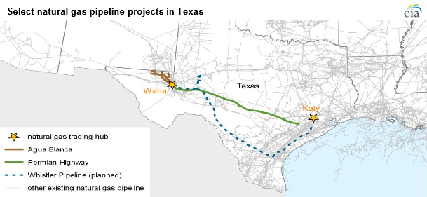 Kinder Morgan’s Permian Highway Pipeline (PHP) entered service in early January. The 430-mile pipeline brings 2.1 Bcf/d of additional natural gas capacity from the Waha Hub, located in West Texas near production activities in the Permian Basin, to Katy, Texas, near the Gulf Coast. It has additional connections to Mexico.