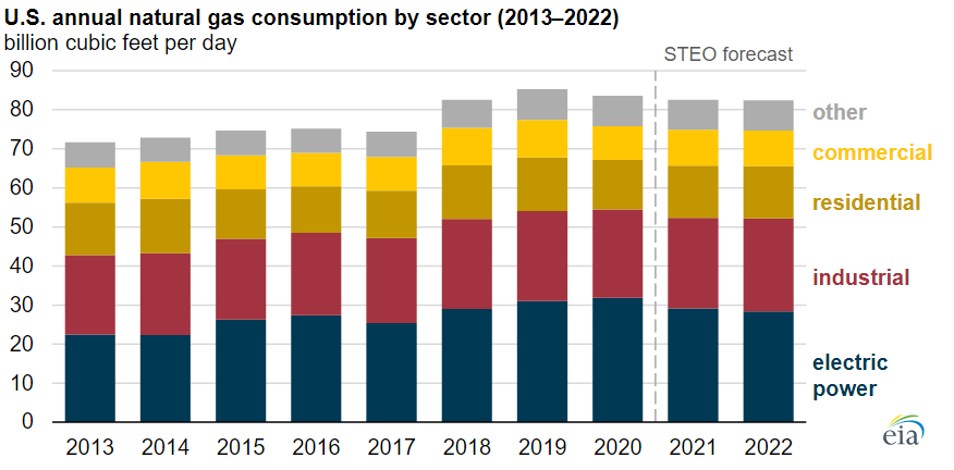 The largest decline will occur in the electric power sector. We expect total U.S. consumption of natural gas to average 82.5 billion cubic feet per day (Bcf/d) in 2021, down 0.7 Bcf/d from 2020. We expect U.S. natural gas consumption in 2022 to increase slightly from 2021 as increasing consumption in the industrial sector offsets declining consumption in the electric power sector, but still remains lower than the 2020 level, the outlook indicates.