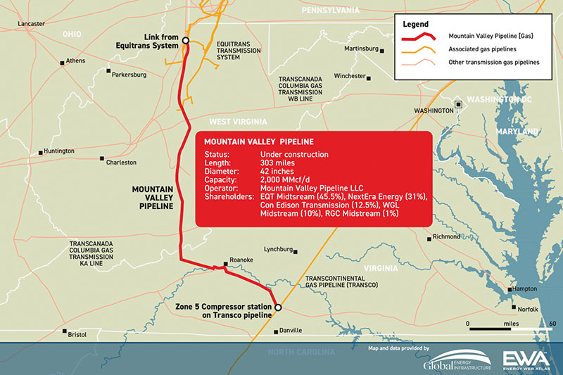 When Mountain Valley construction started in February 2018, Equitrans estimated the 303-mile (488-km), 2.0-billion-cubic-feet-per-day (bcfd) project would cost about $3.5 billion and enter service by late 2018.
