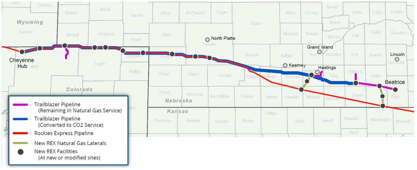 In 2023, Trailblazer submitted a proposal to the Federal Energy Regulatory Commission (FERC) to convert 392 miles of its existing 436-mile 36-inch natural gas pipeline to CO2 service.