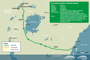 EACOP will connect the Ugandan oilfields to Tanzania's Indian Ocean Tanga port and has been described as the world's longest electrically heated crude pipeline.