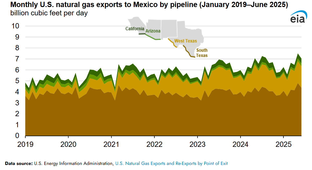 (P&GJ) — U.S. natural gas pipeline exports to Mexico reached a record 7.5 billion cubic feet per day (Bcf/d) in May 2025, according to the U.S. Energy Information Administration (EIA). The increase reflects growing demand from Mexico’s power sector, which continues to rely heavily on U.S. gas to fuel electricity generation.